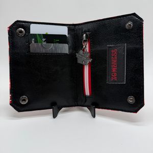 This bifold wallet features 3 card slots and a zipper pocket. The exterior is made with either cotton fabric or faux leather, depending on the style, while the interior is made with faux leather.. Each wallet has a custom zipper pull and snap button closure. It measures approximately 3 1/2 inches wide by 5 inches height.