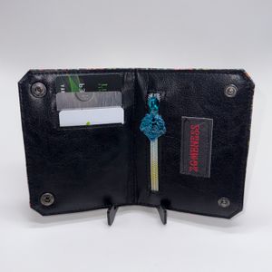This bifold wallet features 3 card slots and a zipper pocket. The exterior is made with either cotton fabric or faux leather, depending on the style, while the interior is made with faux leather.. Each wallet has a custom zipper pull and snap button closure. It measures approximately 3 1/2 inches wide by 5 inches height.