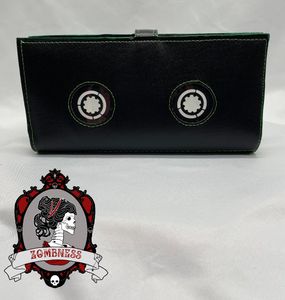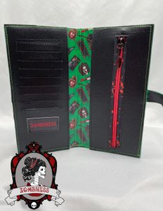 This faux leather wallet features a horror sticker magnetic snap closure, 9 card slots, a zipper pocket and two slip pockets.