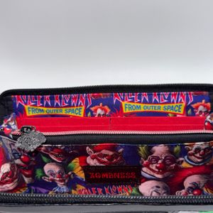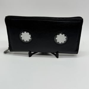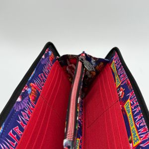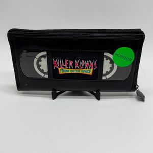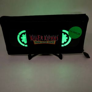 This handmade VHS cassette inspired zip around wallet measures approximately 8 1/2 inches wide by 4 1/4 inches height. It features 12 card slots, 2 bill pockets and an interior zipper pouch. The exterior is made from marine vinyl while the interior is cotton fabric. Featuring custom zipper pulls on the exterior and interior zippers, as well as a glow-in-the-dark "reel" on the exterior.