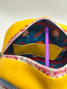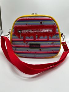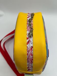 Handbag measuring approximately 10" wide by 8" high and 4.5" deep. Features an exterior zipper pocket and interior slip pocket. Comes with an adjustable strap.