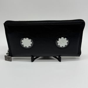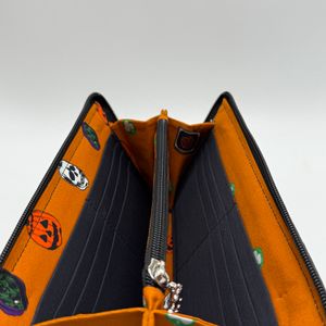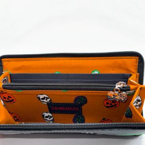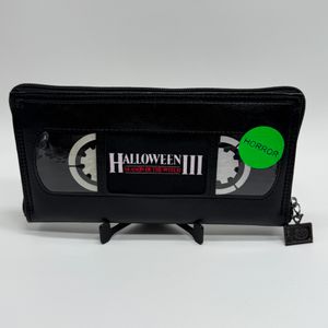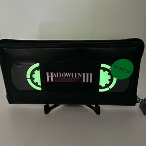 This handmade VHS cassette inspired zip around wallet measures approximately 8 1/2 inches wide by 4 1/4 inches height. It features 12 card slots, 2 bill pockets and an interior zipper pouch. The exterior is made from marine vinyl while the interior is cotton fabric. Featuring custom zipper pulls on the exterior and interior zippers, as well as a glow-in-the-dark "reel" on the exterior.