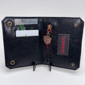 This bifold wallet features 3 card slots and a zipper pocket. The exterior is made with either cotton fabric or faux leather, depending on the style, while the interior is made with faux leather.. Each wallet has a custom zipper pull and snap button closure. It measures approximately 3 1/2 inches wide by 5 inches height.