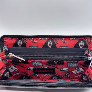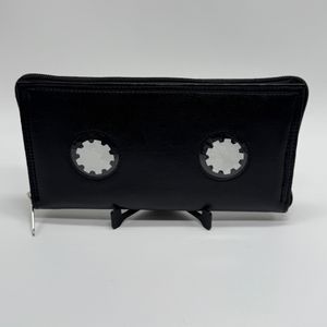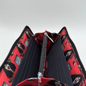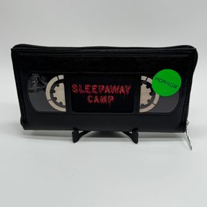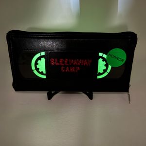 This handmade VHS cassette inspired zip around wallet measures approximately 8 1/2 inches wide by 4 1/4 inches height. It features 12 card slots, 2 bill pockets and an interior zipper pouch. The exterior is made from marine vinyl while the interior is cotton fabric. Featuring custom zipper pulls on the exterior and interior zippers, as well as a glow-in-the-dark "reel" on the exterior.